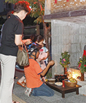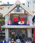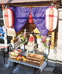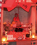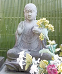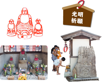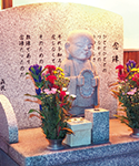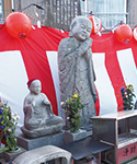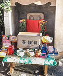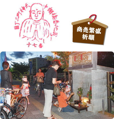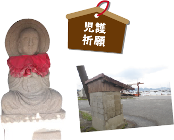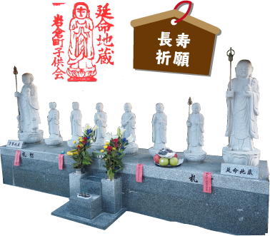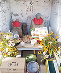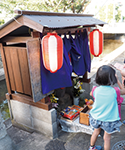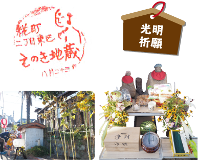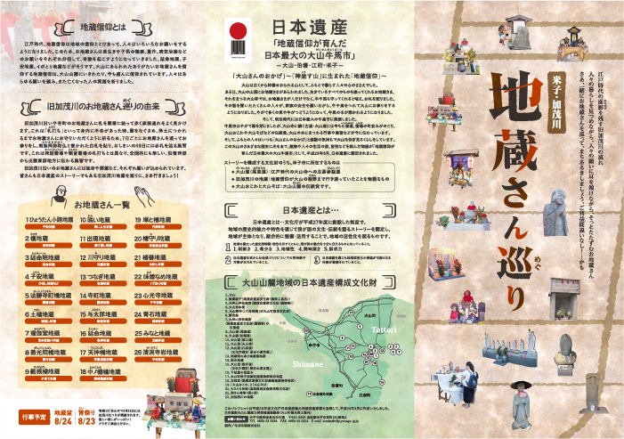旧加茂川沿いや寺町のお地蔵さんに札を順番に貼って歩く家族連れをよく見かけます。これは「札打(ふだう)ち」といって身内に不幸があった時、霊をなぐさめ、浄土につかれるまでお地蔵さんにお守りいただくように祈るため、7日ごとにお地蔵さんを巡ってお参りをし、南無阿弥陀仏(なむあみだぶつ)と書かれた白札を貼り、おしまいの49日には赤札を貼る風習です。これは西国霊場(さいごくれいじょう)や観音(かんのん)霊場の札打ちとは異なり、全国的にも珍しい、伯耆西部から出雲東部地方に伝わる風習です。